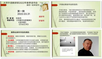 白淑霞老师针对《中国文化的精神》一书的读后感围绕当下中国文化走出去的时代命题,以图文并茂的方式向我们展现了她在读完此书后关于中国文化的传承和用英语讲好中国故事的深刻思考。杜娟老师从批判性思维的角度,对《中国文化的精神》一书中反映中的作者的哲学观、作者对于冯友兰先生的点评和作者关于中国文化的部分观点进行了深刻思考,并提出了自己的质疑,极具创新性。