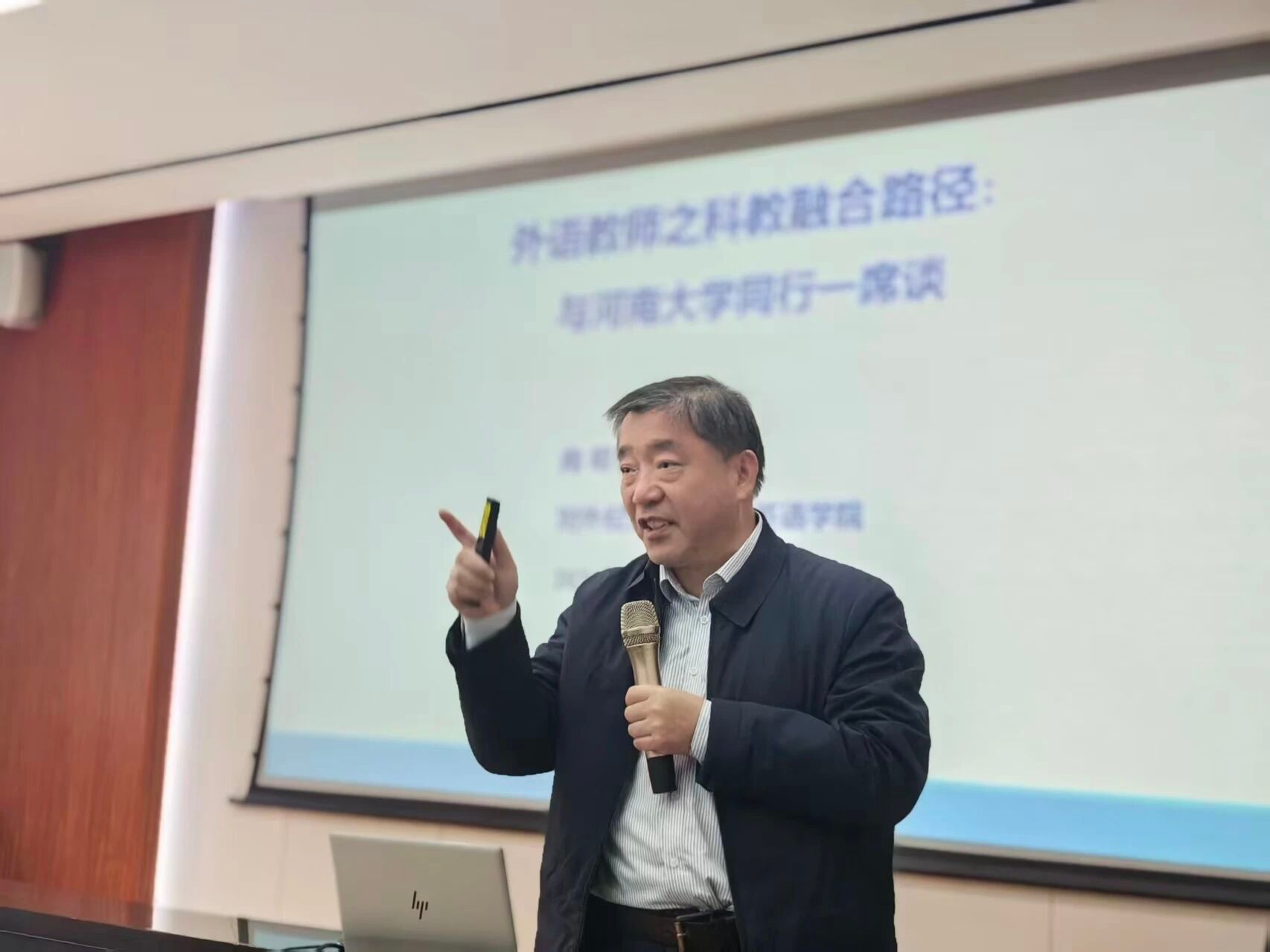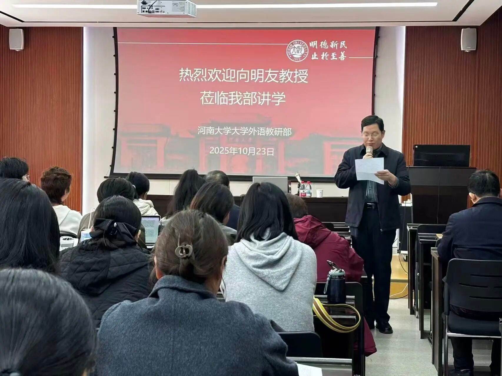2025年10月23日,对外经济贸易大学向明友教授应M88 APP下载之邀,做客“大学英语名家讲坛”,做了题为“外语教师之科教融合路径”的学术讲座。讲座在M88 APP下载一楼大会议室举行,由部党委书记、主任杨剑波主持。